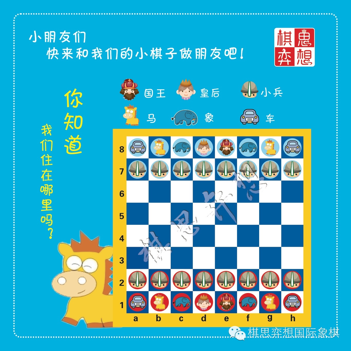 认识了打仗的战场,接下来我们来认识一下这些英勇的小战士吧! 国际象棋黑白方各有16个棋子,走棋时一方执白,一方执黑;并把所有的棋子按照规定的位置摆好,这叫初始位置。白棋摆在一、二横排;黑棋摆在七、八横排。这些小棋子都站在哪里呢?教小朋友一首棋子摆放儿歌: